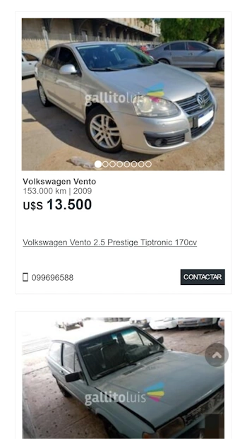 - Información: Si bien todas las tarjetas tienen la marca, el modelo, el kilometraje (o si es nuevo) y el precio, es interesante observar cómo algunos diseñadores se las ingenian para empaquetar una cantidad significativa de información útil en el mismo espacio en el que otros no incluyen casi nada, como salta a la vista si comparamos Carros.com de Brasil con El País de Colombia o El Gallito de Uruguay.